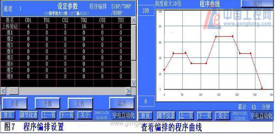 對于518P、708P、808P程序參數設置,點擊【A】框,進入【手/自動、編程設置控制平臺】;圖5所示的編程界面:出現【通道一程序編排設置】;程序編排平臺用組別配方來設置程序段【C01】和【T01】表示,以【組1】為例:點擊選中【組1】點擊組名【C01】下面的數據框輸入溫度值【250】(注:在溫度欄C01輸入的數值要放大10倍如25℃輸入的數據是【250】放大10倍);點擊組名T01下的時間段寫入實際時間值分鐘如15分鐘寫入【15】;設置好程序配方選中配方組如:【組1】在菜單條中點擊【查看】可看到已編排的曲線圖形;點擊【返回】;選中編輯好的配方組【組1】點擊【下載】操作,已編排的程序就下傳給程序儀表;即時可操作【運行】【停止】【暫?!俊臼謩印俊咀詣印俊痉祷亍?。采用【上傳驗證】儀表中的程序曲線來檢驗程序是否下傳,程序配方可保存15組程序在觸摸屏中。圖7